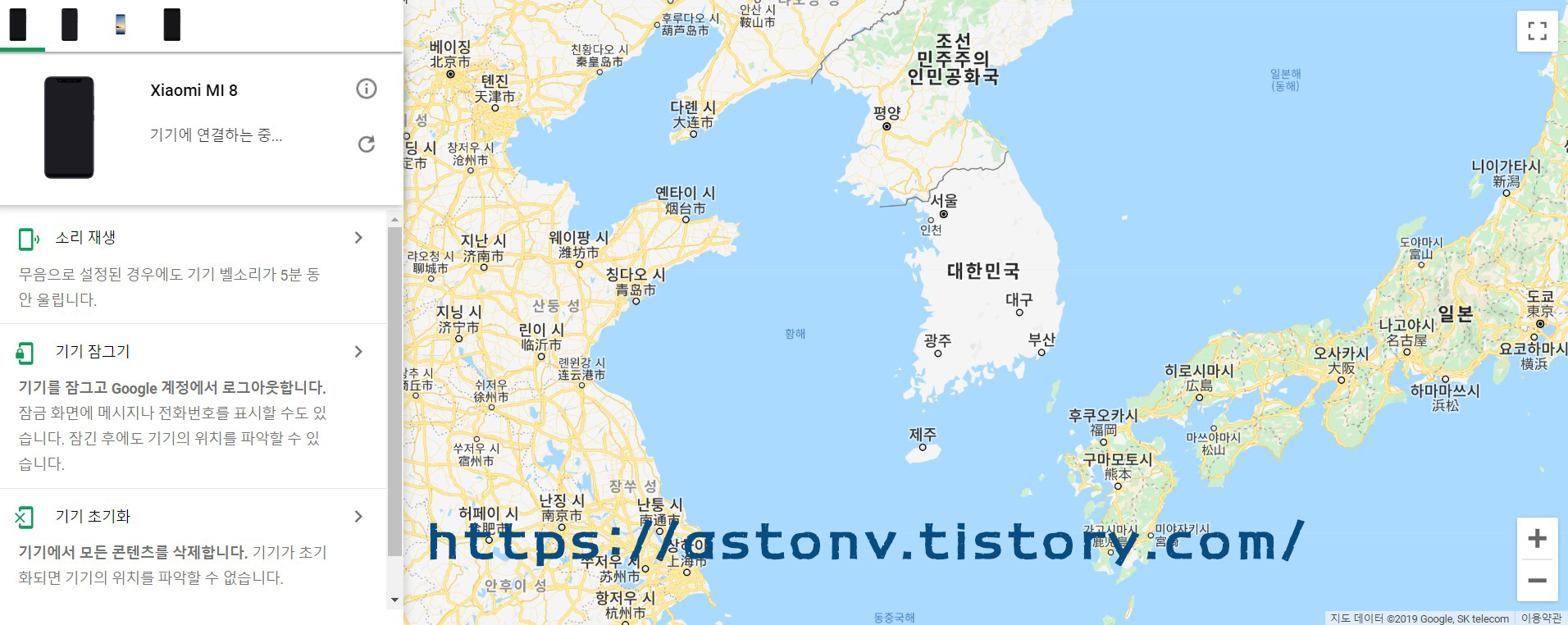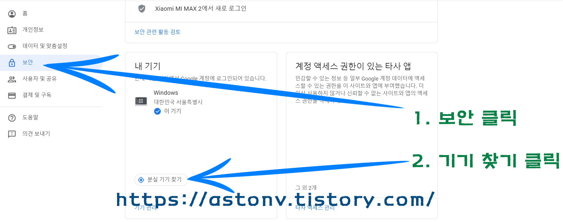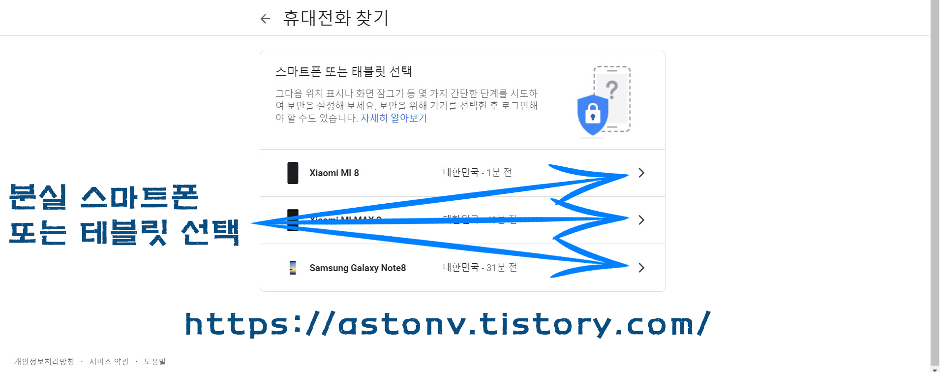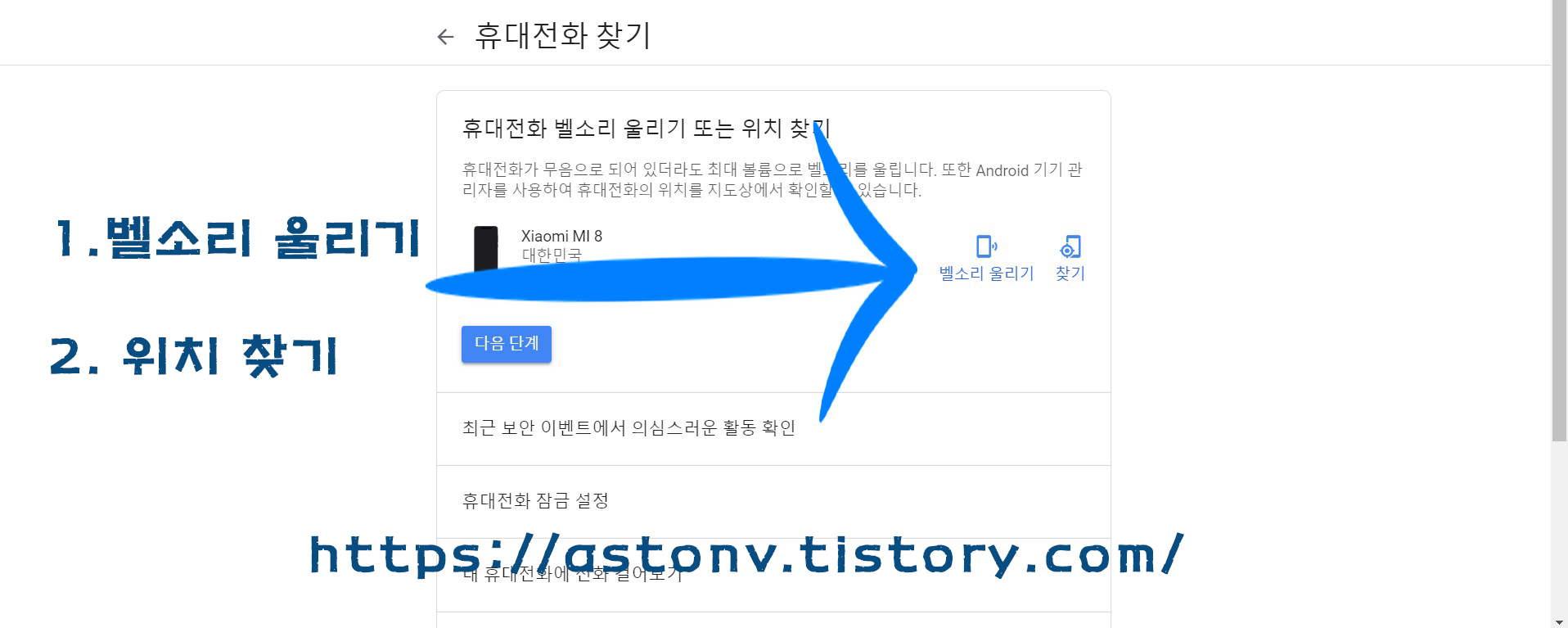 그 후 내계정 -> 보안 -> 분실기기찾기 -> 스마트폰 또는 테블릿 선택