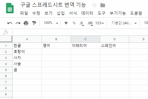=GOOGLETRANSLATE(셀좌표 혹은 단어, "출발어 혹은 auto", "도착어")